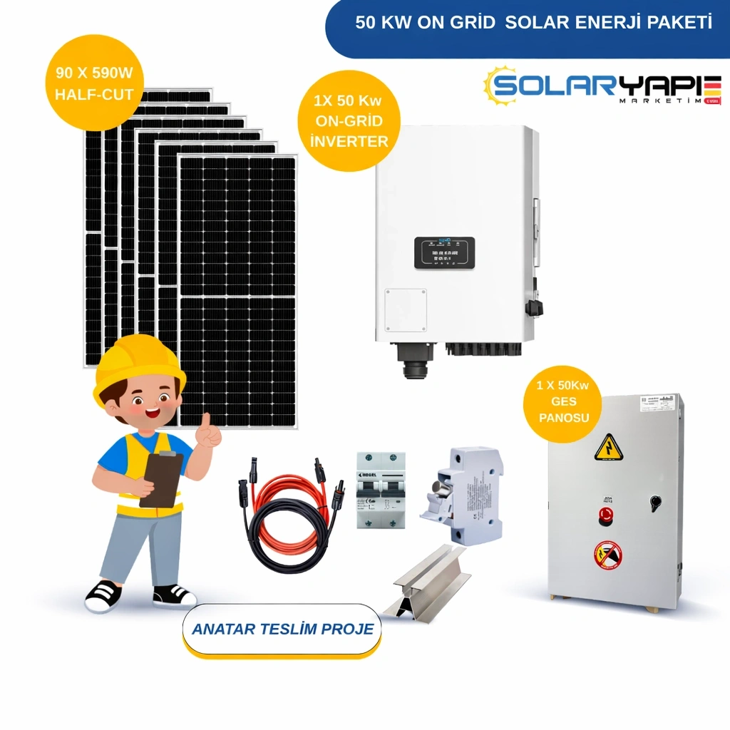 50 kW On Grid Güneş Enerji Paketi, yüksek elektrik tüketimi olan işletmeler, fabrikalar, atölyeler, tarımsal tesisler ve ticari yapılar için özel olarak hazırlanmış şebeke bağlantılı (on-grid) profesyonel GES sistemidir.