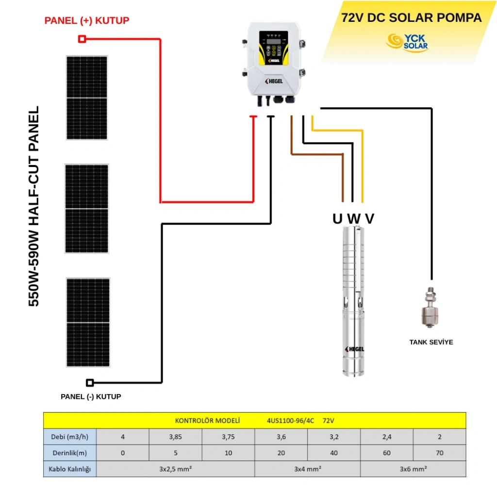 - 72 Volt sistem, daha yüksek güç kapasitesiyle büyük sulama alanları için uygundur.