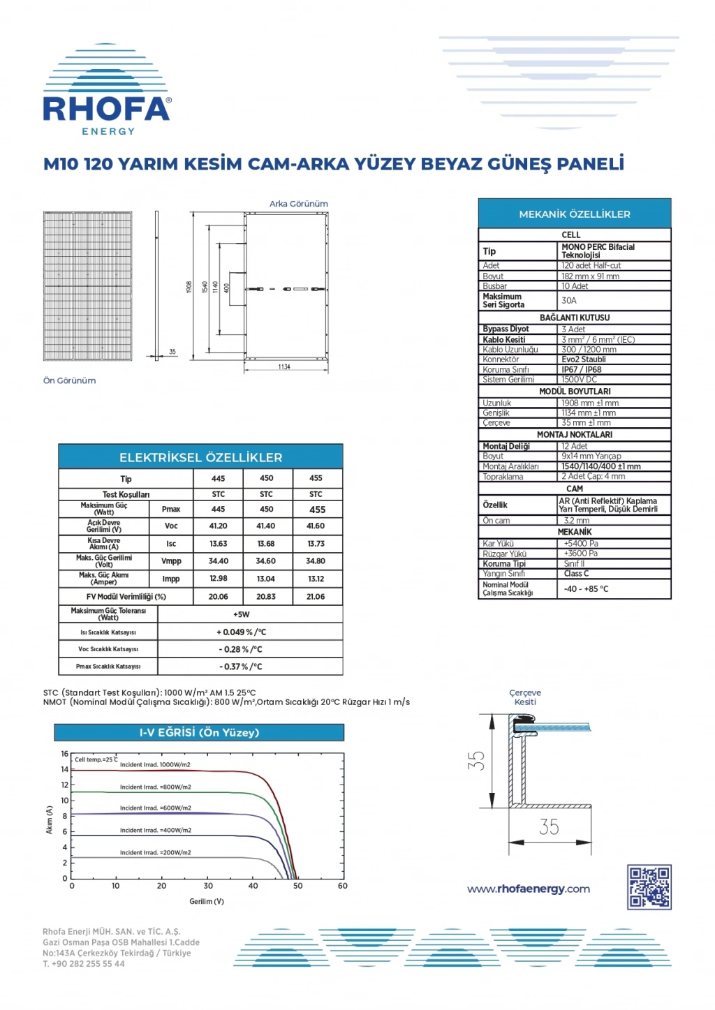 M10 120 Yarım Kesim Cam Arka Yüzey Beyaz Güneş Paneli, yüksek verimlilik, uzun ömür ve zorlu çevre koşullarına dayanıklılık sunmak üzere geliştirilmiştir. M10 (182x182 mm) yarım kesim hücre teknolojisi sayesinde gölgeleme etkileri minimize edilirken, düşük ışınım koşullarında dahi yüksek enerji üretimi sağlanır.