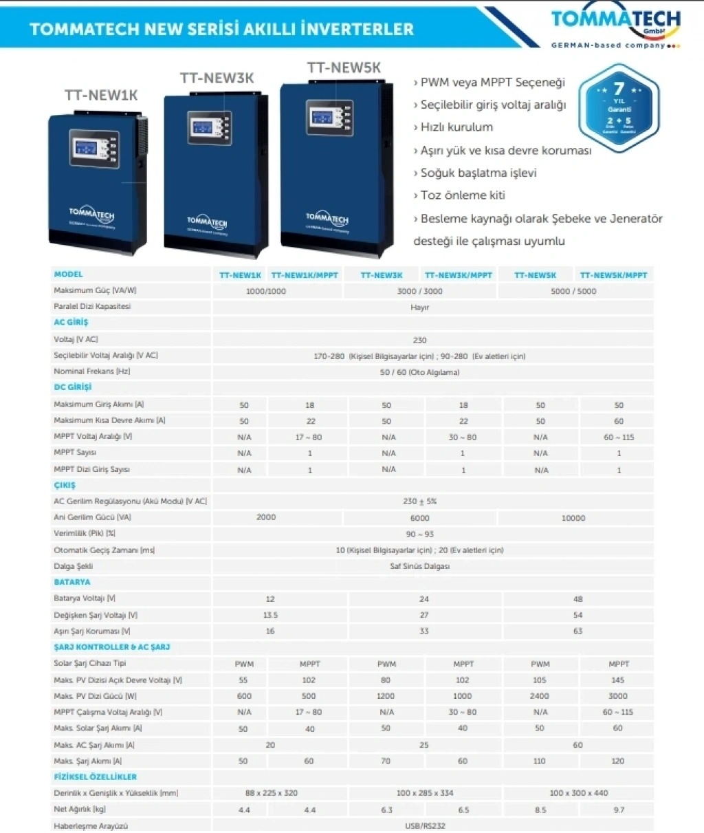 Aşırı yük, kısa devre ve diğer elektriksel risklere karşı gelişmiş koruma sistemleri ile donatılan TommaTech New 1K inverter, dayanıklı yapısı, 2 yıl ürün garantisi ve 5 yıl parça garantisi ile uzun ömürlü ve güvenilir bir kullanım sunar. Küçük ev sistemleri, yazlıklar, karavanlar ve temel off-grid uygulamalar için ideal bir çözümdür.