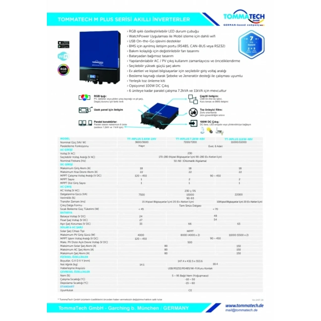 TommaTech Plus 7.2kW 48V MPPT Akıllı İnverter; off-grid ve hibrit kurulumlarda yüksek performans, uzun ömür ve tam enerji kontrolü sunmak için geliştirilmiş yeni nesil bir güç yönetim sistemidir. 48V lityum ve jel akülerle tam uyumlu çalışan bu model, güçlü MPPT şarj teknolojisi ve akıllı çalışma modlarıyla maksimum verim sağlar.