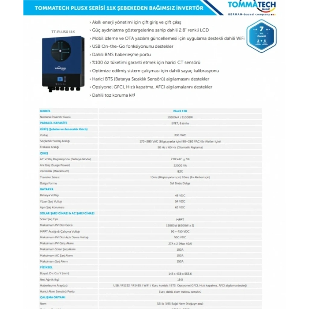 TommaTech PlusX Serisi 11K 48V Tek Faz Akıllı İnverter, yüksek kapasiteli off-grid güneş enerji sistemleri için geliştirilmiş, güçlü ve akıllı bir inverter çözümüdür. 11 kW çıkış gücü sayesinde konut, ticari ve profesyonel uygulamalarda yüksek performanslı enerji yönetimi sağlar.