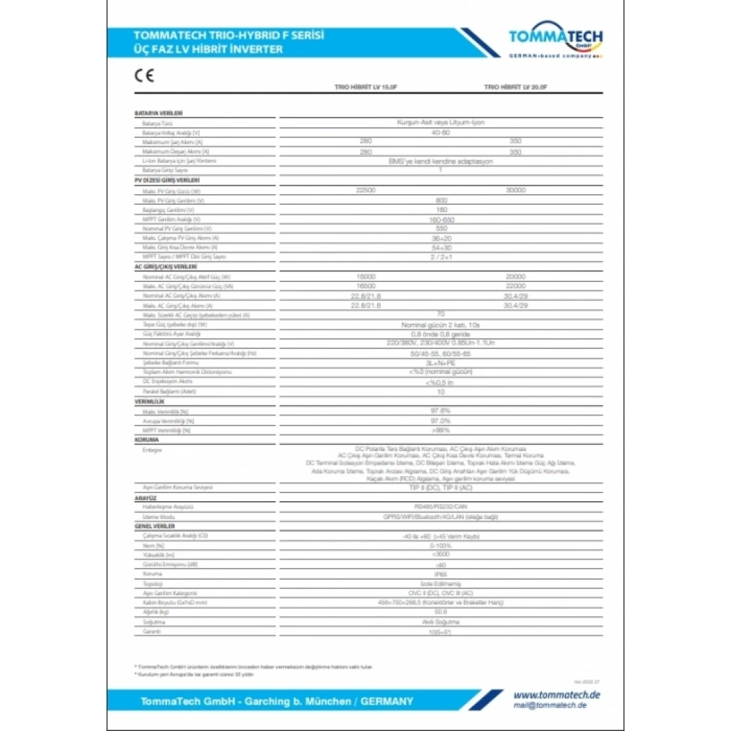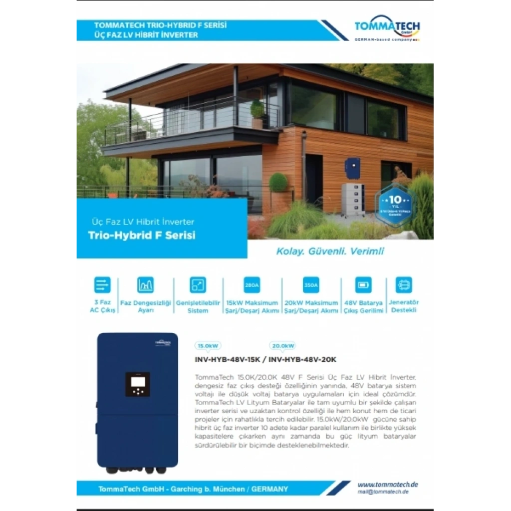 TommaTech Trio-Hybrid F Serisi 15 kW hibrit inverter, 10 yıla kadar garanti seçeneği ve yüksek mühendislik kalitesiyle uzun ömürlü, sağlam ve sürdürülebilir bir enerji çözümü sunar.